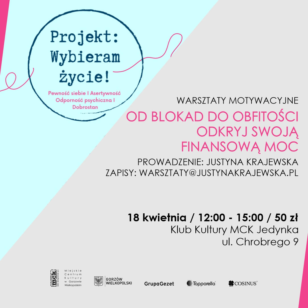 Zapraszamy na kwietniowe spotkanie w ramach projektu społecznego „Wybieram Życie”. Tym razem skupimy się na temacie, który dotyka codzienności każdej z nas – relacji z pieniędzmi, poczucia bezpieczeństwa finansowego, proszenia o więcej i szeroko pojętej obfitości.