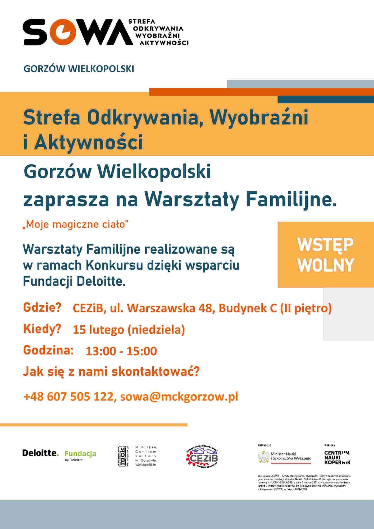 Inicjatywa „SOWA – Strefa Odkrywania, Wyobraźni i Aktywności” finansowana jest w ramach dotacji Ministra Nauki i Szkolnictwa Wyższego, na podstawie umowy Nr 1/CNK-SOWA/2021 z dnia 2 marca 2021 r. w sprawie uruchomienia przez Centrum Nauki Kopernik 50 lokalnych Stref Odkrywania, Wyobraźni i Aktywności (SOWA) w latach 2021–2028.